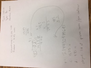 Today was another wednesday challenge. The challenge was to estimate the number of pie without using pie (3.14). Groups had to use measurements such as circumfrence and diameter to find it. The people in my group were Jason and Christian. We measured a glue container. To get the diameter we used a ruler, and to find the circumfrence, we used a piece of rope and wrapped it around.