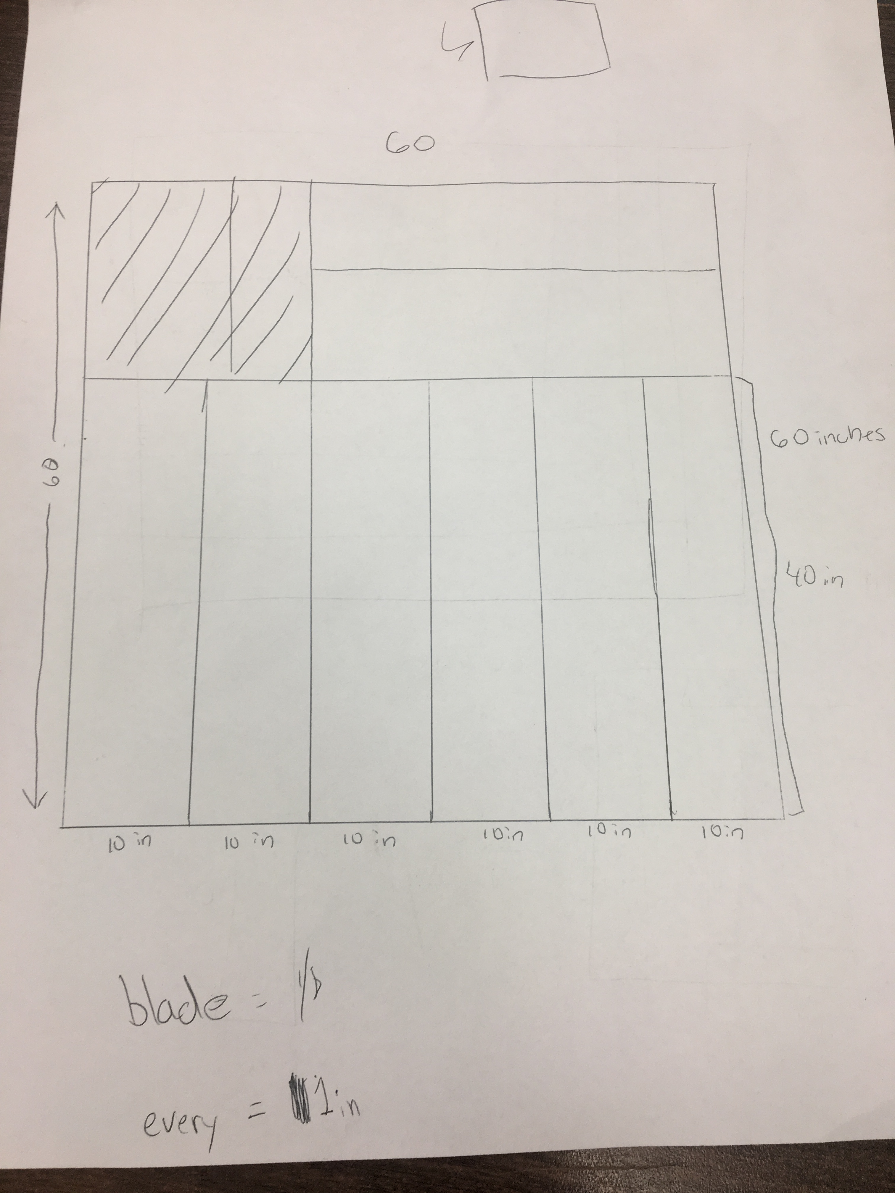 Today we did another wednesday challenge. The challenge was to Figure out how many planks you can cut out of a 5’x5’ piece of wood. Each plank has to be the same size with a width of 10” and a height of 32”-46”. We first found out how many planks could fit across the 5’ wide board. We were able to fit 6, but we forgot to account the width of the saw blade. So without the extra sawblade width, we fit in 8 boards and had a square of about 20” x 20” left of waste. Our group was very confused for most of the time.